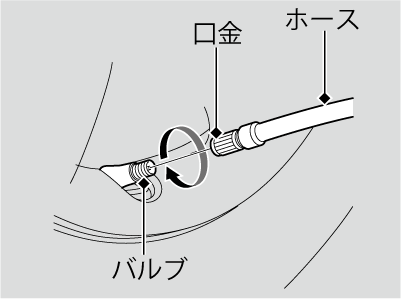 - バルブにエアコンプレッサーのホースを確実に取り付ける。