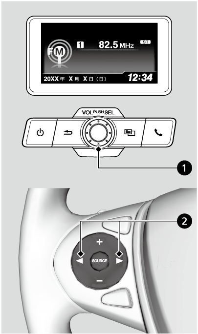 を回して「プリセットリスト」画面からあらかじめ登録してある放送局を選局できます。➋