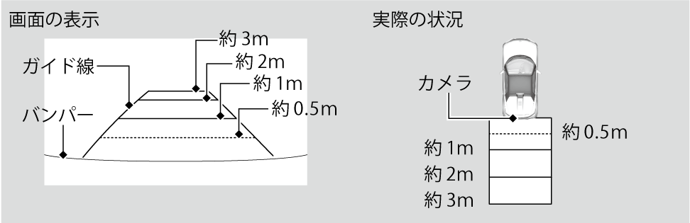リヤカメラシステムのカメラは特殊なレンズを使用しているため、画面に表示される映像の距離感覚は実際の距離とは異なります。