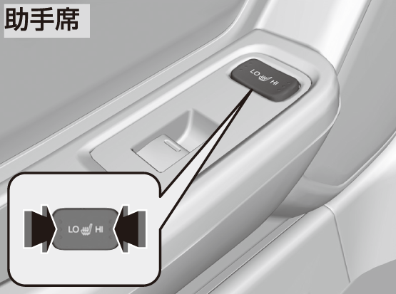 シートを早く暖めたいときはHI側を押します。暖まったらLO側にしてください。