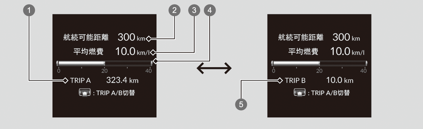 トリップメーターA、Bと連動し、それぞれの平均燃費を一定時間ごとに更新してkm/lで表示します。