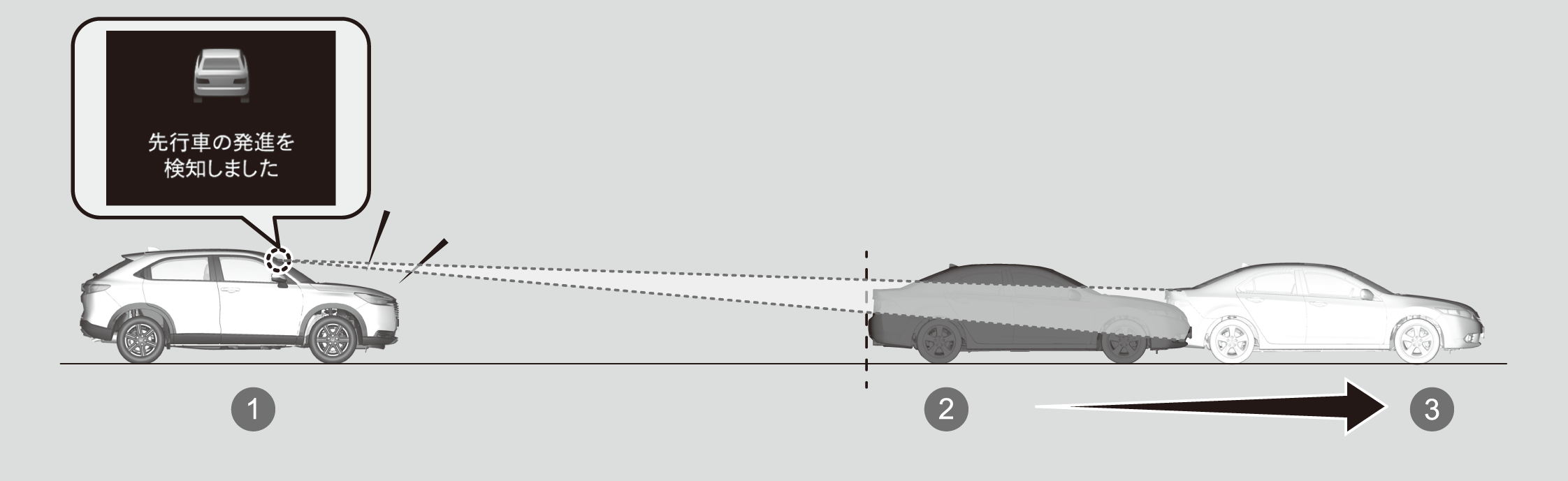先行車に続いて停車(停止状態での車間距離が約10m以内、かつ自車・先行車がしばらく停止)すると先行車を認識し続け、先行車の発進を検知しても自車が停止し続けたときに作動します。