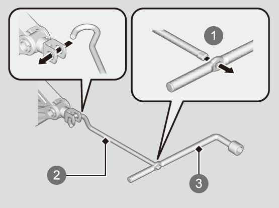 - ジャッキハンドル(別売り)とジャッキハンドルバー(別売り)を使って、タイヤが地面から離れるまで車体を上げる。