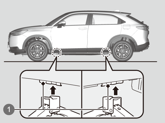 この車には、ジャッキが標準で搭載されていません。ジャッキアップをする場合は、この車専用のジャッキをお使いください。詳しくはHonda販売店にご相談ください。他のジャッキでは支えられる重量(呼荷重)が不足したり、形状が合わないことがあります。