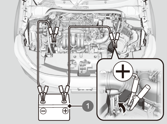 - ケーブルの反対側を、救援車のバッテリーの+端子に接続する。