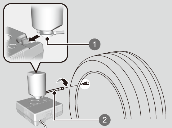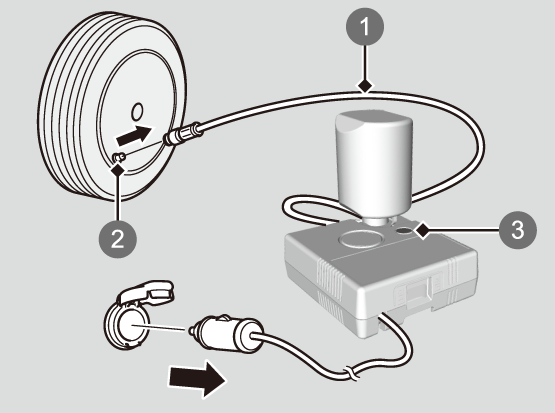 - コンプレッサーはタイヤに応急修理剤とエアを注入し始めます。