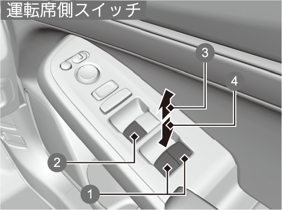 パワーモードがONモードのときに、パワーウィンドーの開閉操作を行うことができます。開閉はそれぞれのドアにあるスイッチで行います。