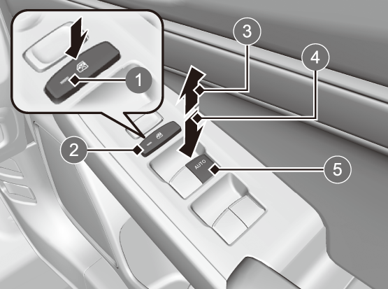 運転席のスイッチでは、すべてのウィンドーの開閉操作を行うことができます。運転席以外のウィンドーの開閉は、運転席のパワーウィンドーロックボタンをOFFにしてから行います。