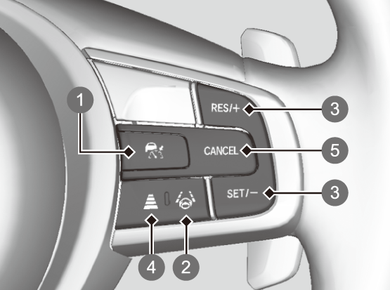 3 RES/+スイッチ/SET/−スイッチ渋滞追従機能付ACCの車速のセットと復帰、設定車速の調整を行います。