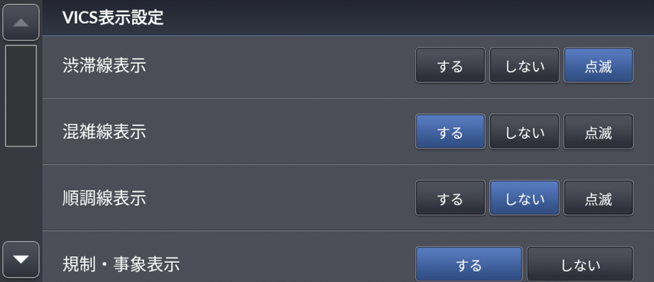 規制・事象表示:交通規制に関するVICS情報マークと規制区間を表示します。(初期値:する)
