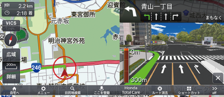 一部の交差点では、300m手前でリアルな拡大図が表示されます。曲がる方向、目印となる施設、交差点までの距離を表示します。
