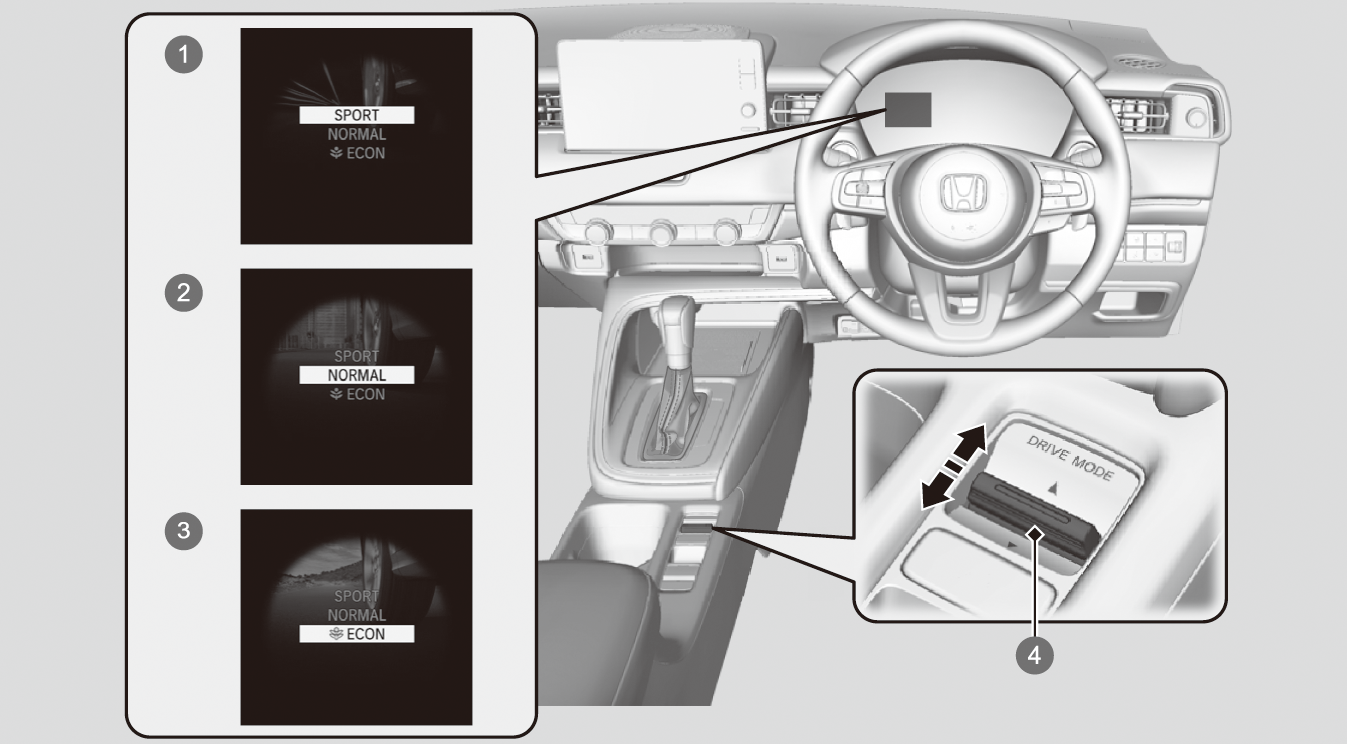 ドライブモードスイッチでSPORTモード、NORMALモード、ECONモードの3つのモードから走行モードを切り換えることができます。