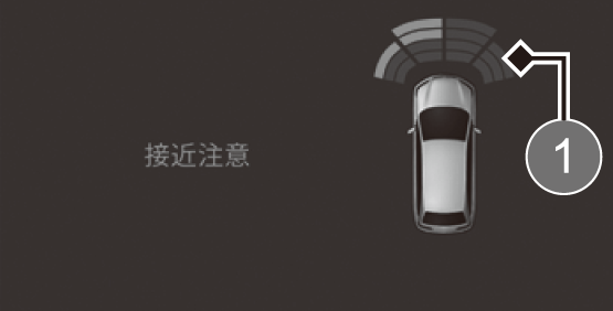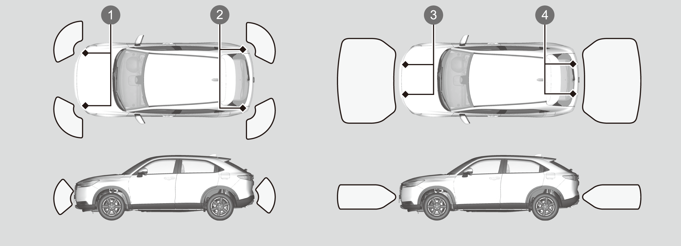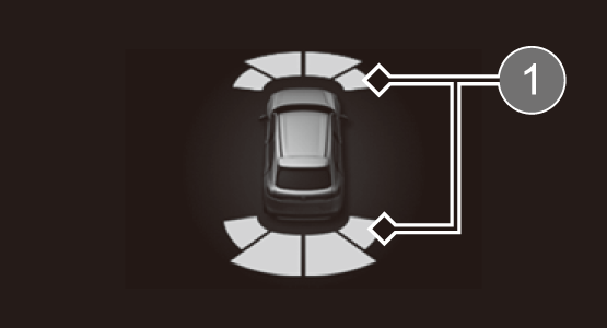 車両前方のフロントセンターセンサーおよびフロントコーナーセンサーと車両後方のリヤセンターセンサーおよびリヤコーナーセンサーが障害物を検知し、障害物と車両の距離をブザーとマルチインフォメーションディスプレイとオーディオ/ インフォメーション画面✤で知らせます。