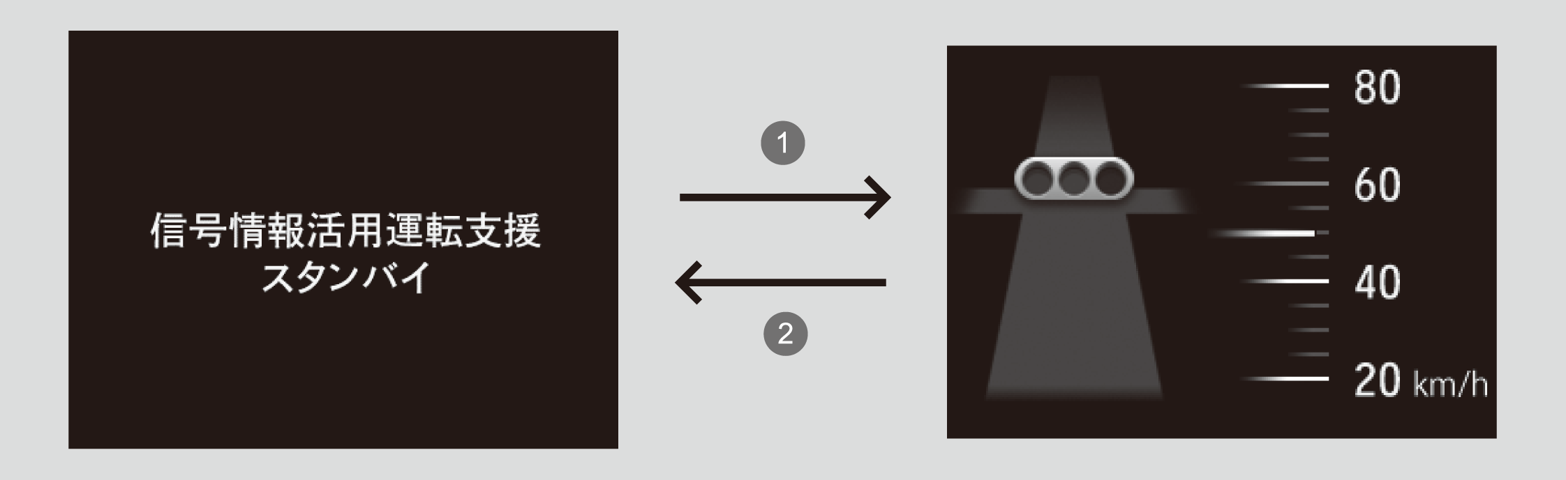 信号情報活用運転支援システムは走行時に受信した複数の交差点の信号予定情報を基に、信号通過支援、赤信号減速支援、発進遅れ防止支援をマルチインフォメーションディスプレイ内に表示し、運転者にお知らせする機能です。