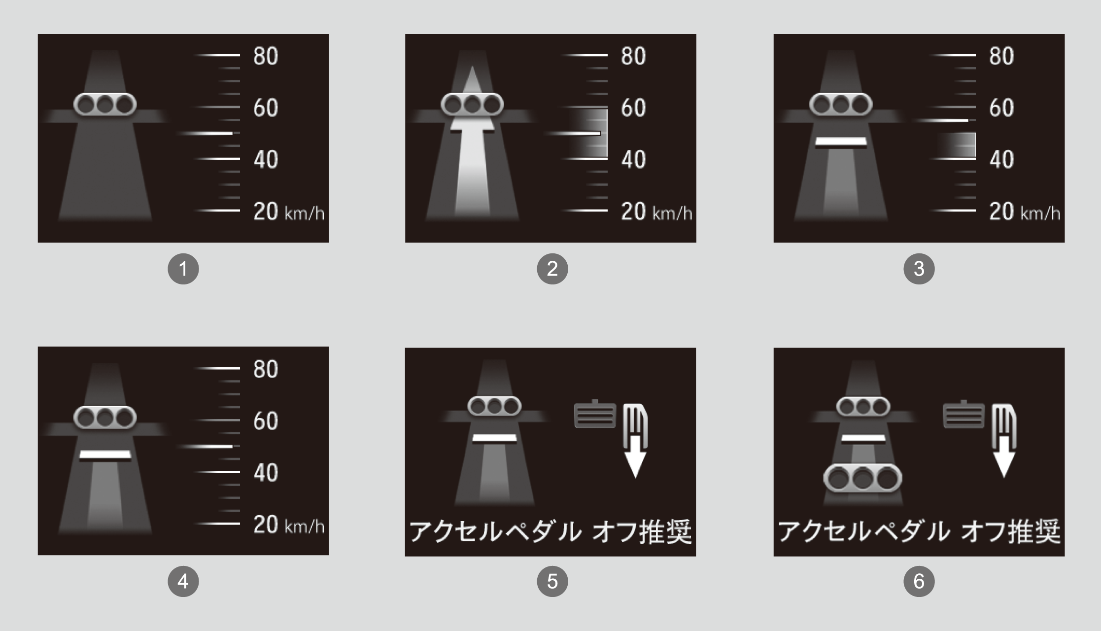各支援表示に合わせ周囲の状況を確認しながら適切に走行することで省燃費運転を手助けします。