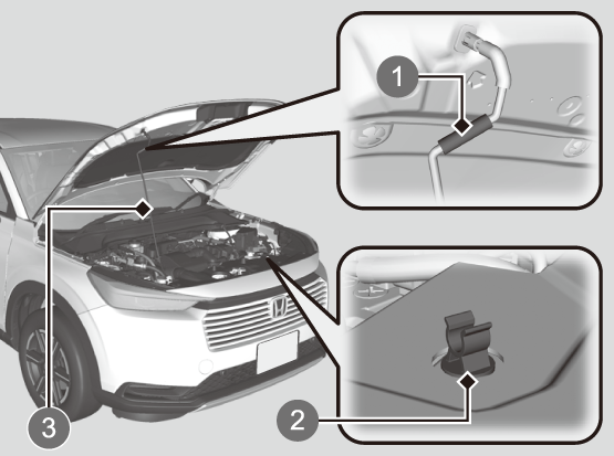 - グリップを持ってステーをクランプから取り外し、ステーをボンネットにかける。