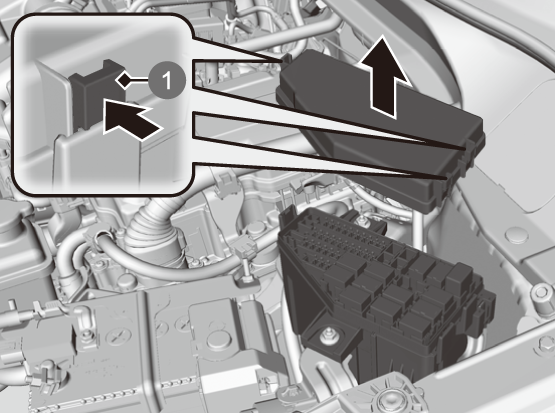 - エンジンルーム内のヒューズボックスAのフタを取り外す。