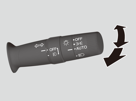 ヘッドライトが点灯しているとき、レバーを前方に押すとハイビームに切り換わります。手前に引くとロービームに戻ります。