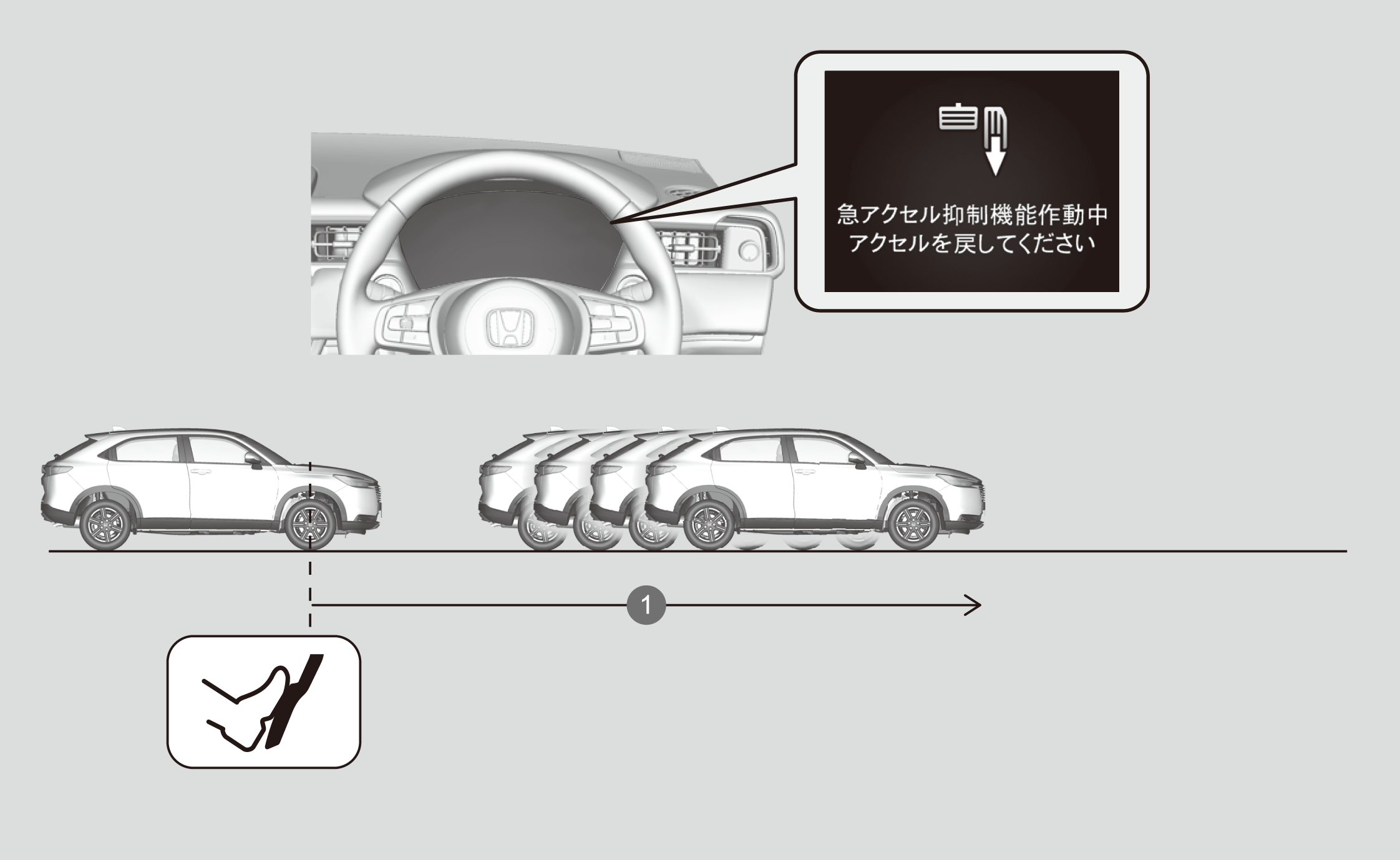 アクセルペダルの踏み間違いや踏みすぎによる急加速を抑制するとともに、音と表示で知らせる運転支援機能です。