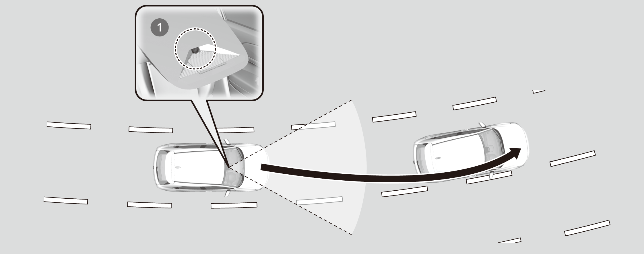 トラフィックジャムアシストは、フロントガラス上部に設置してあるカメラによって、左右の白線(黄線)をとらえ、車線の中央を走行するようにハンドル操作をアシストし、渋滞時に車線維持走行を補助するための機能です。