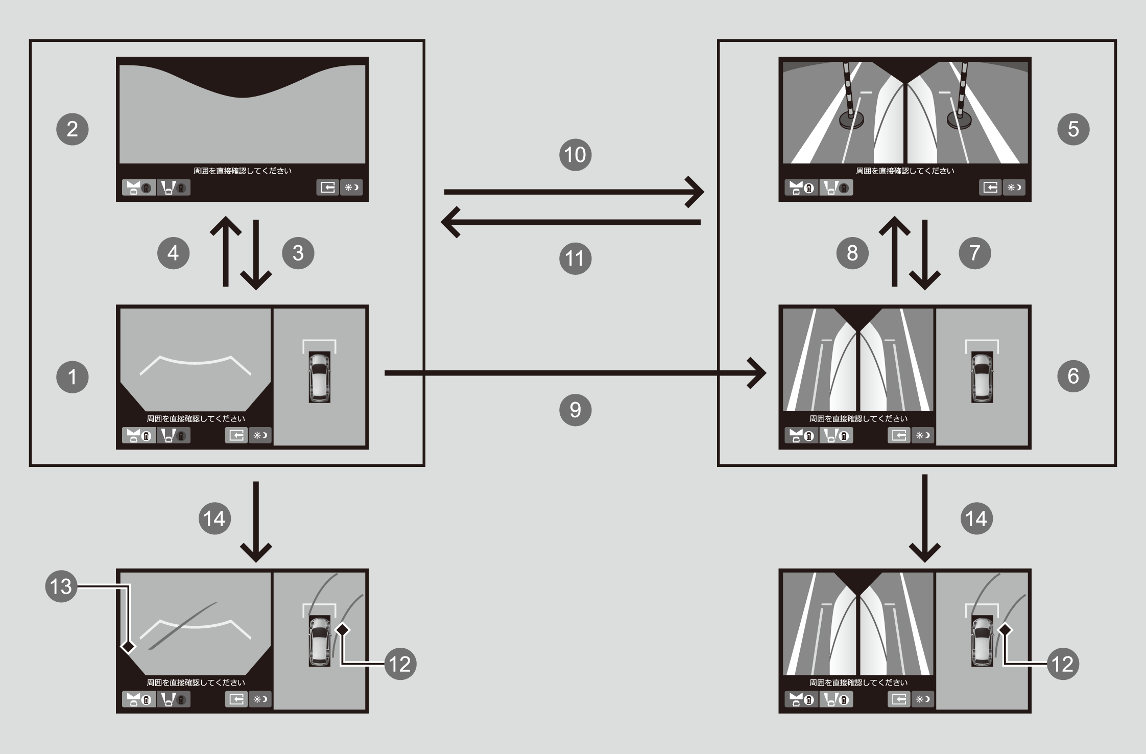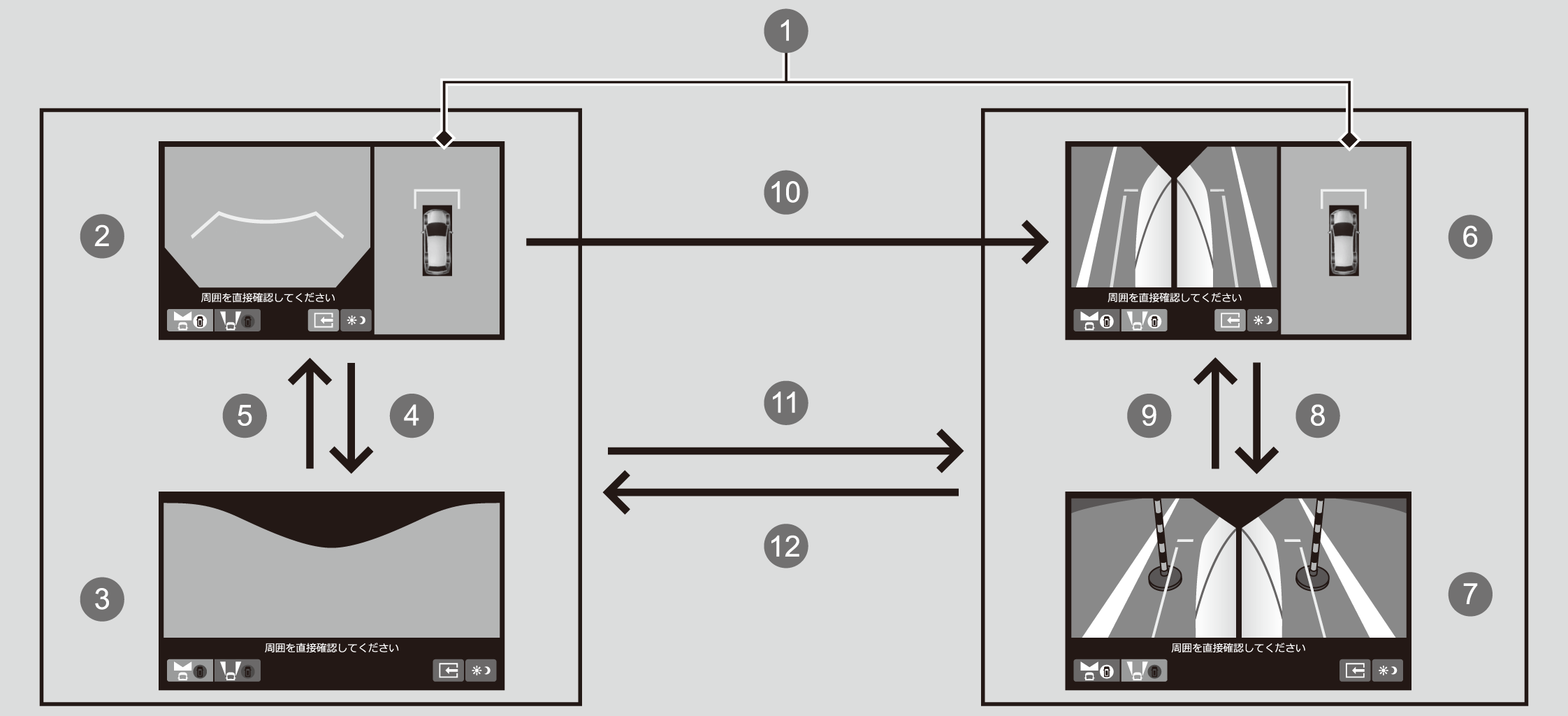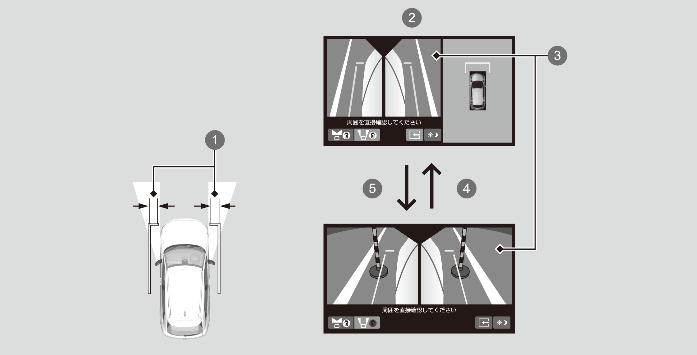 - グラウンドビュー:4台のカメラでとらえた合成画像で、車両を真上から見たイメージで表現されます。