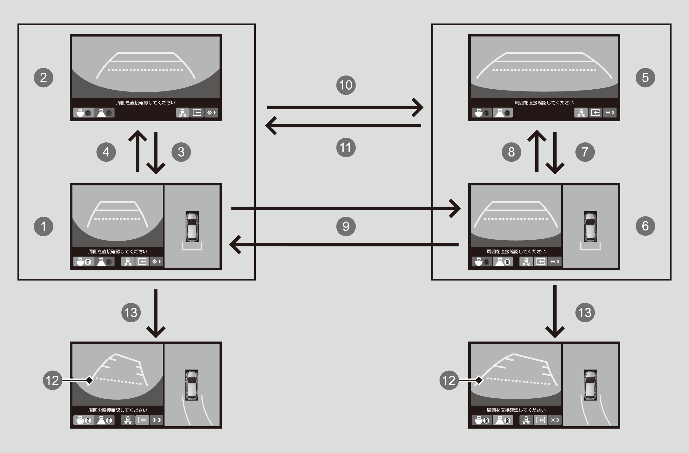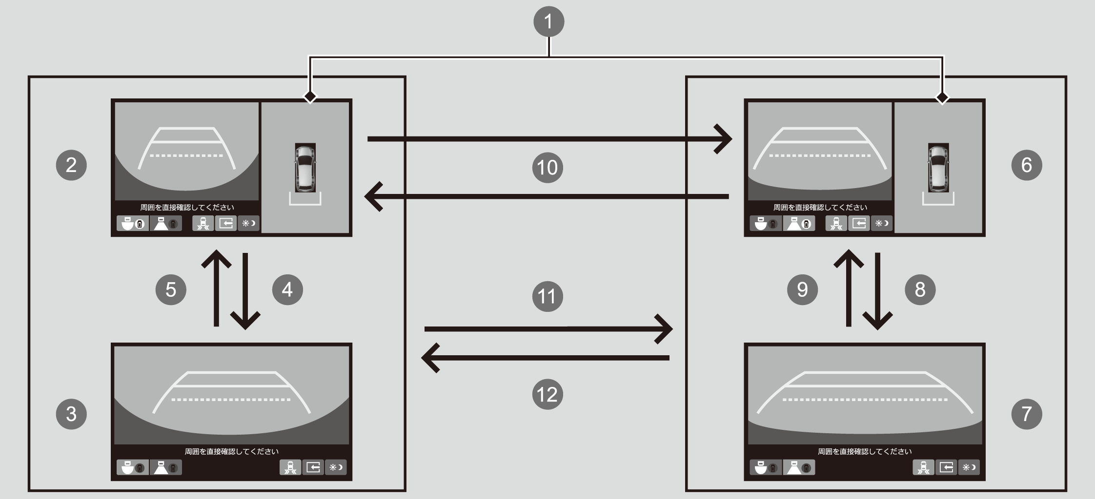 左右サイドビューは、ドアミラーを格納しているときは表示されません。