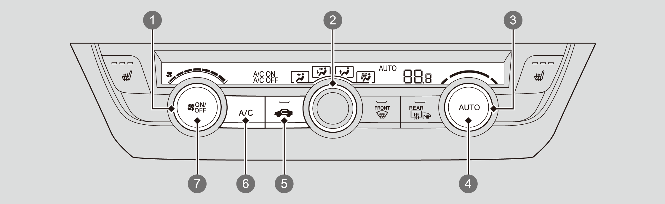 - 内気(表示灯点灯):トンネルや渋滞などで、汚れた空気を車内に入れたくない場合