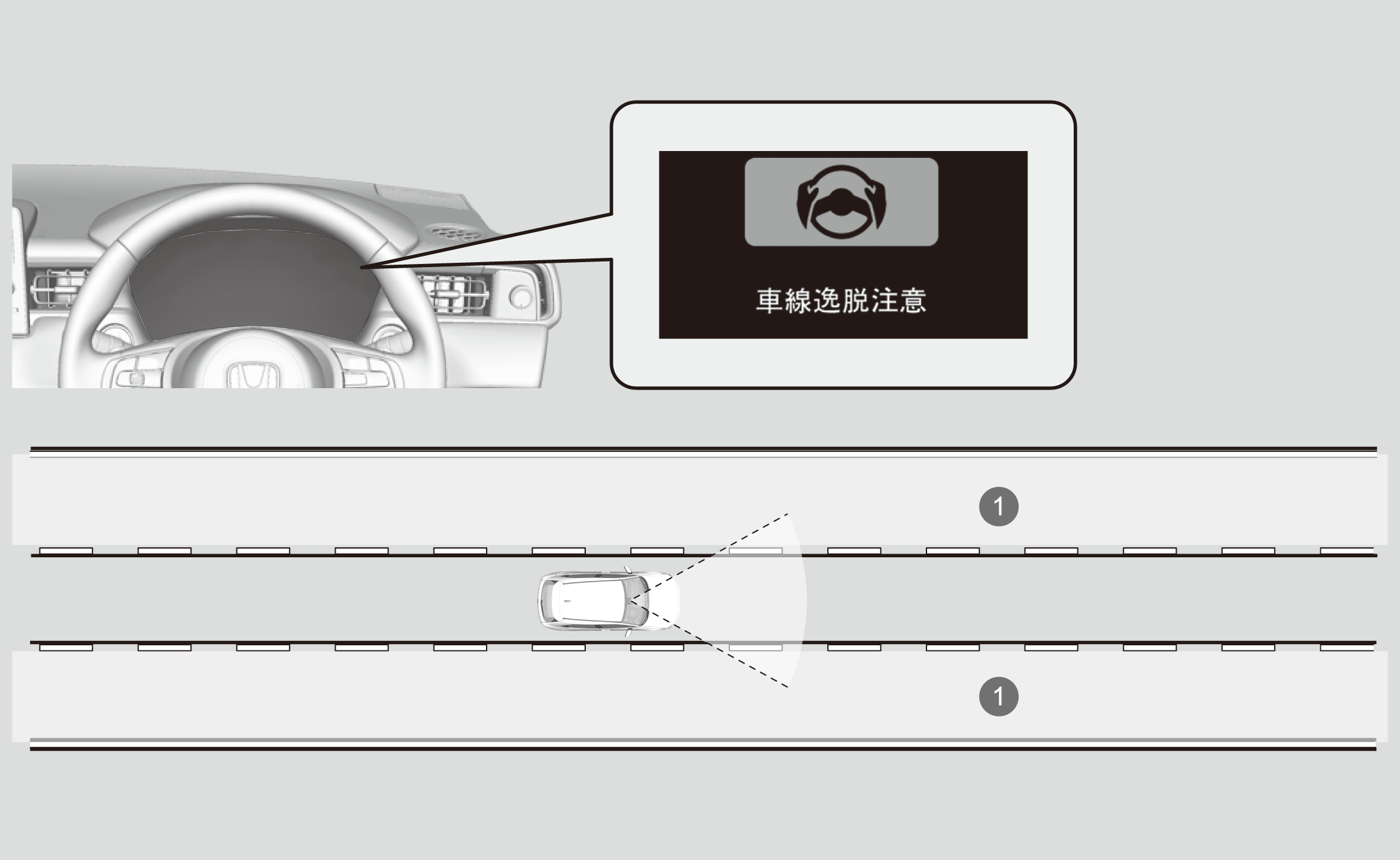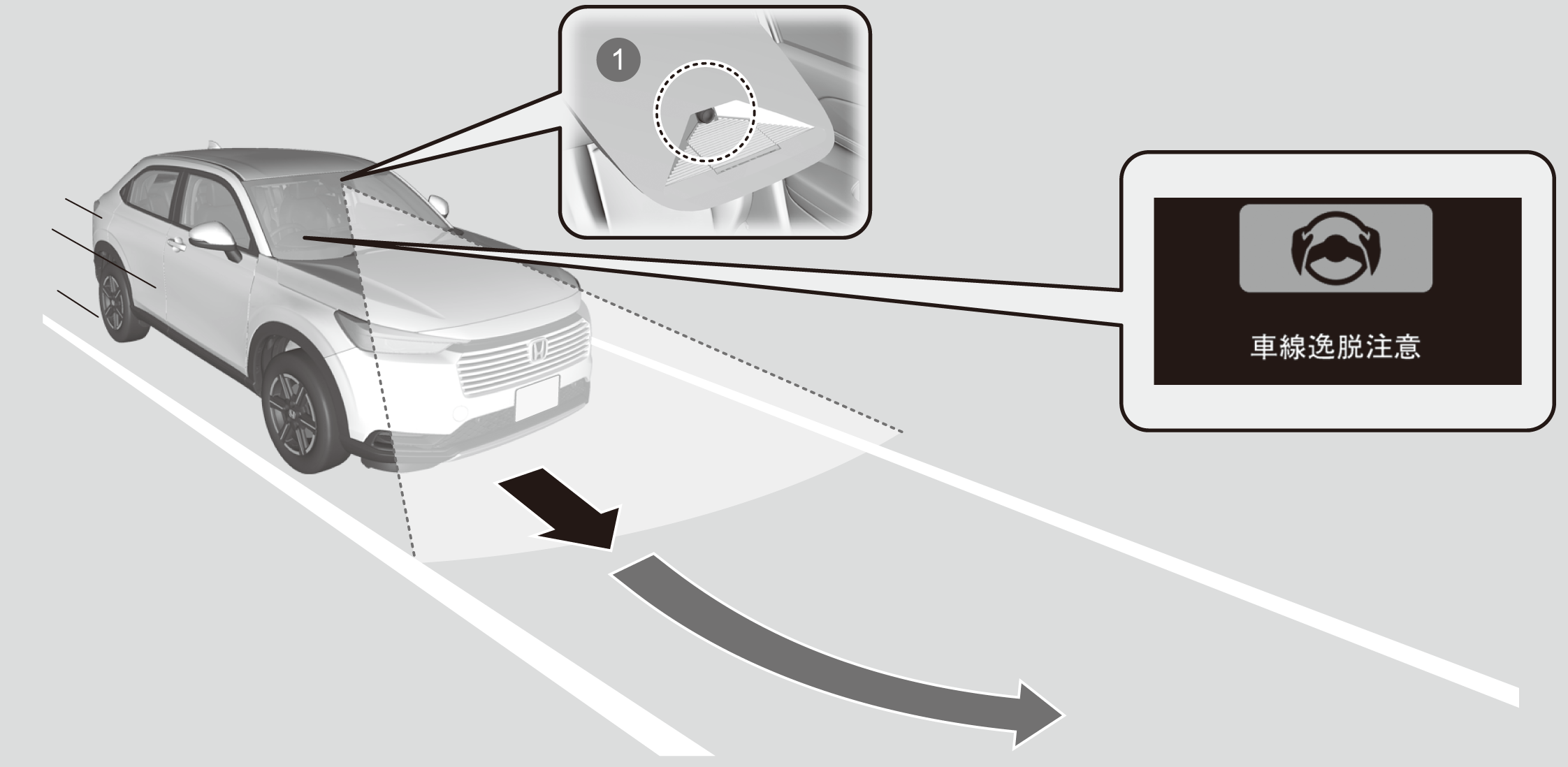 車が警報エリアに入ると車線逸脱の警報をハンドルの振動と音およびディスプレイ表示で行います。