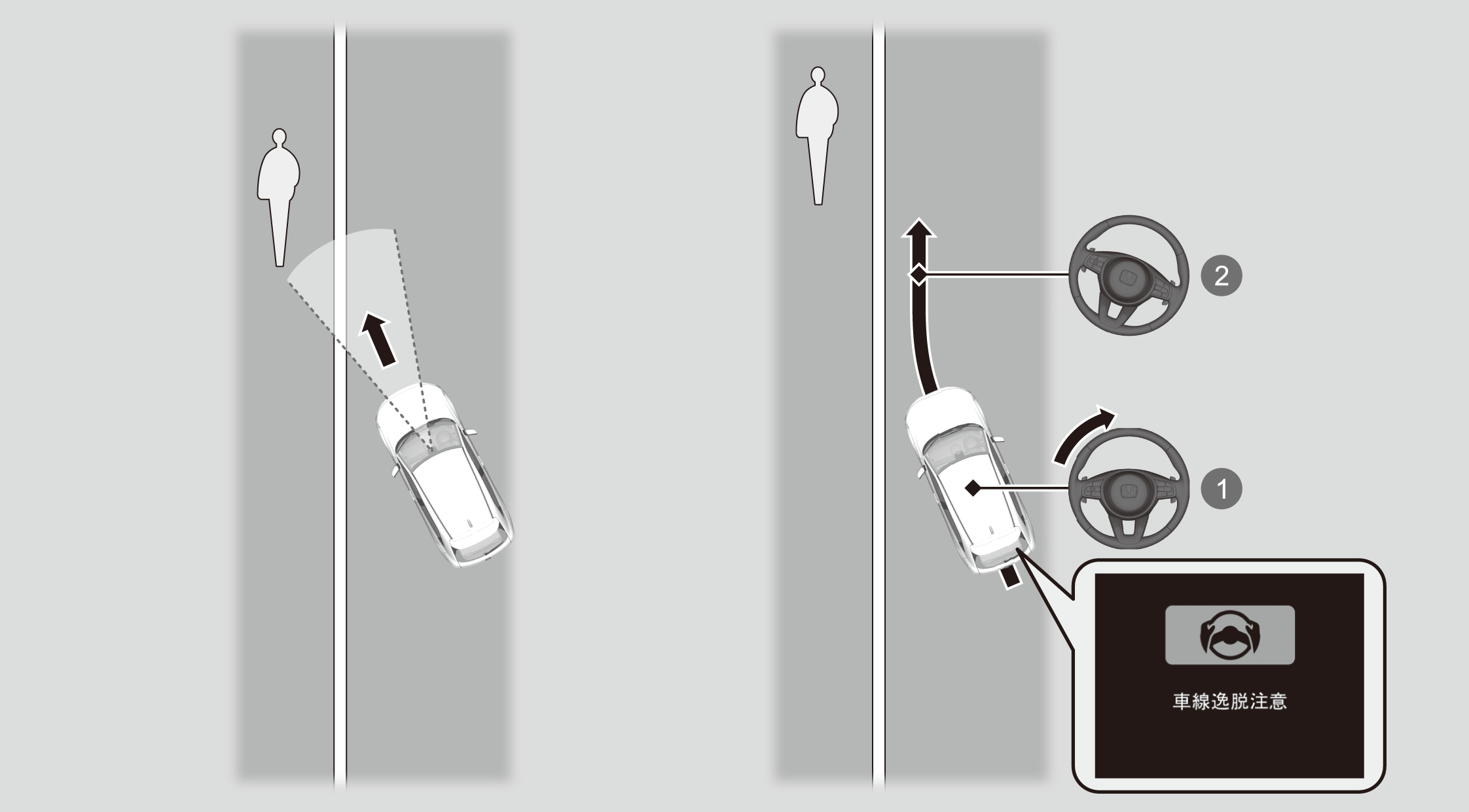 カメラにより歩行者と白線(黄線)を検出し、ステアリング操作を支援することにより運転者の衝突回避操作を促します。