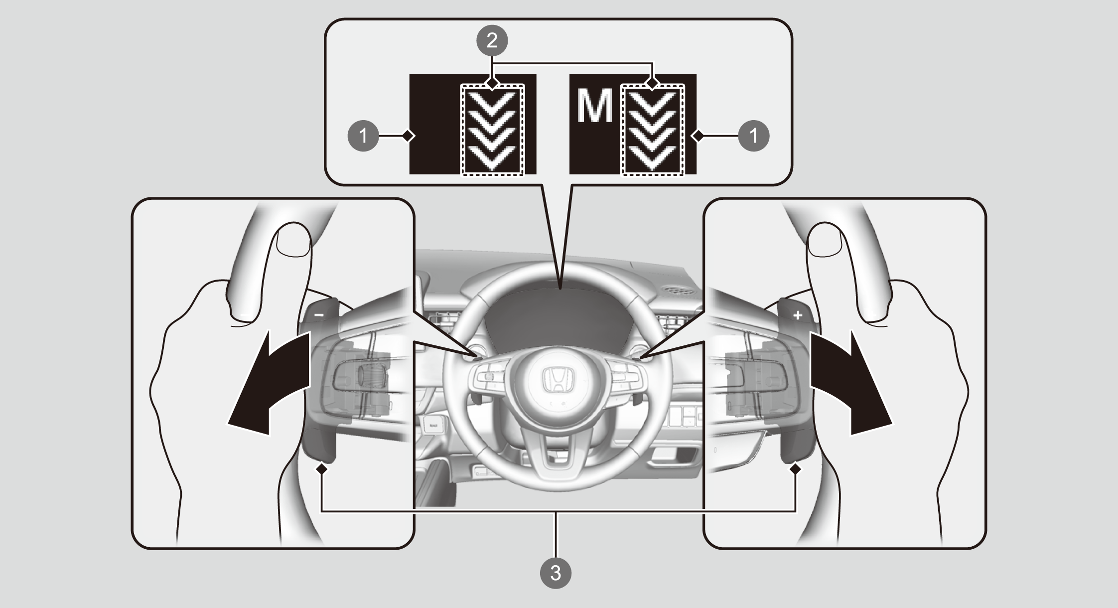 ハンドルにあるセレクターで、アクセルペダルを離したときの減速の強さをハンドルから手を離さずに、4段階で変更できます。前走車との車間調整や坂道などで減速の強さを変更したいときに使用してください。