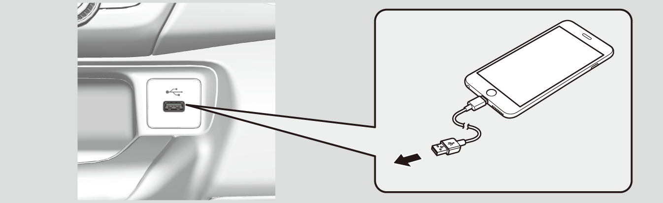 iPodのUSBコネクターを、USBジャック(音楽再生/スマートフォン接続用)に接続する。