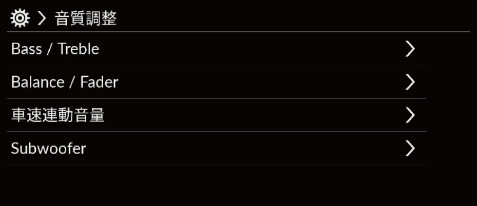 Bass、Treble、Balance、Fader、Sub Woofer✤を調整します。また、車速連動音量の設定も行います。