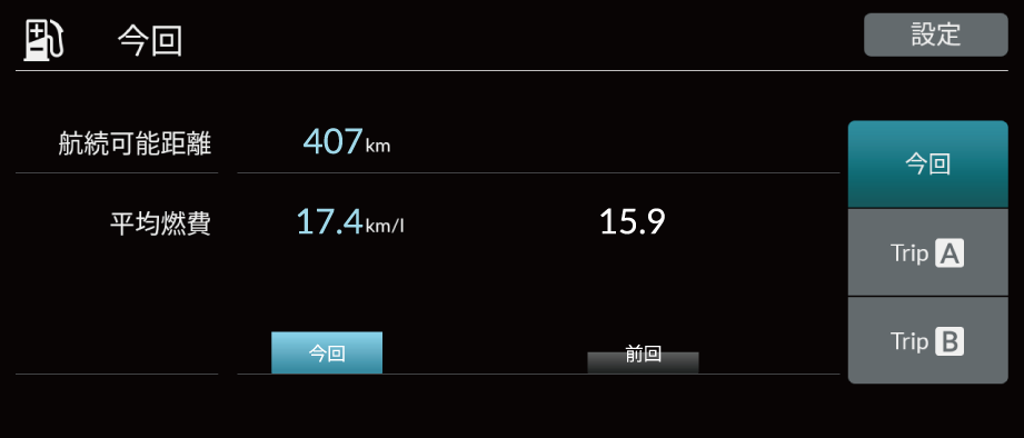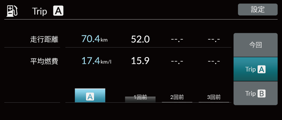 - 1回前、2回前、3回前:Trip A/Trip Bをリセットする毎の履歴を過去3回まで確認できます。