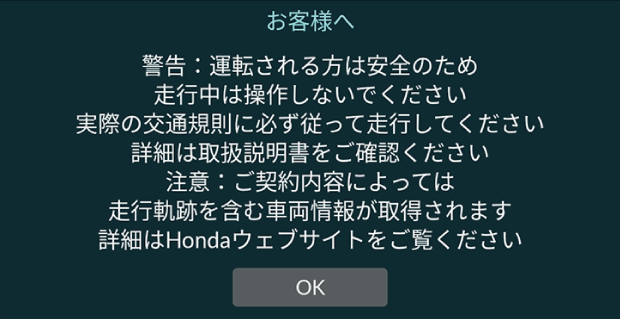 Honda CONNECTディスプレイを起動すると、警告画面が表示されます。よくお読み頂き操作してください。