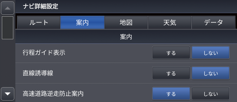 - 高速道路逆走防止案内:自車位置情報や地図情報から高速道路上での逆走およびバック走行を検知したとき、画像と音声で案内します。(初期値:する)