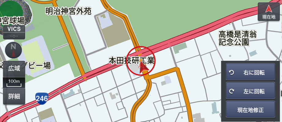 - 現在地修正:GPS測位状態の影響で位置が自動的に修正されない場合など、手動で現在の位置を修正します。