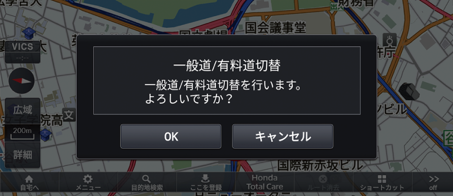 - ルート案内中の場合、切替え後の道路(一般道路、有料道路)で新しいルートが再計算されます。