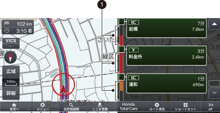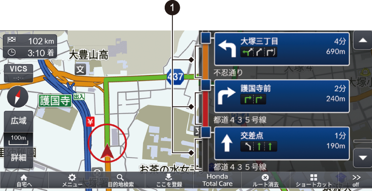 - 現在地より先の案内地点、道路名、現在地からの距離と時間を表示します。