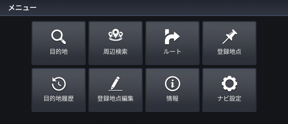 目的地の設定やルートの変更など、ナビゲーションに関するさまざまな機能はナビメニューから表示します。