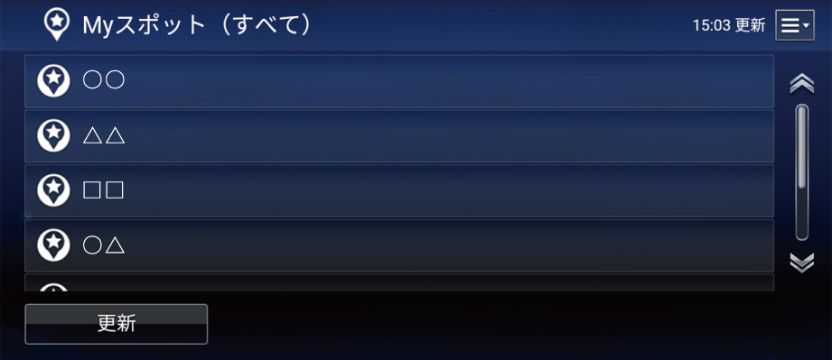 - 登録地点:お気に入りの場所など、登録した地点のリストを表示します。リストから目的地として設定できます。