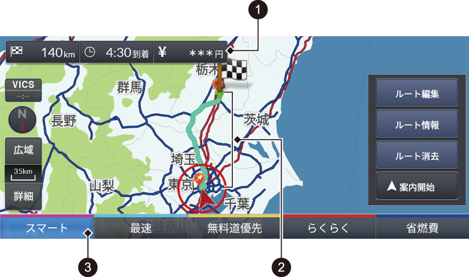 - ナビ詳細設定で「ルート探索・案内」のスマートIC考慮がするの場合、スマートIC通過ルートで案内を開始します。