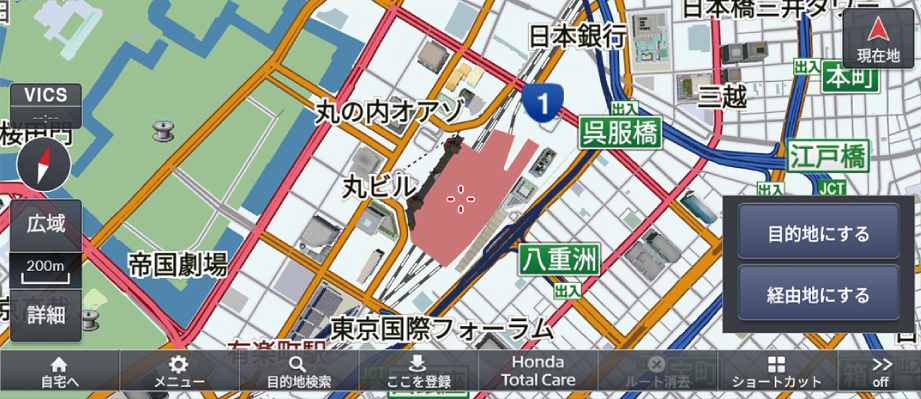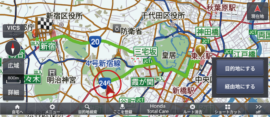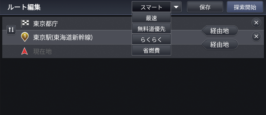 - ルート編集:現在のルートに経由地を追加、変更、消去します。また、ルートの計算条件を変更できます。
