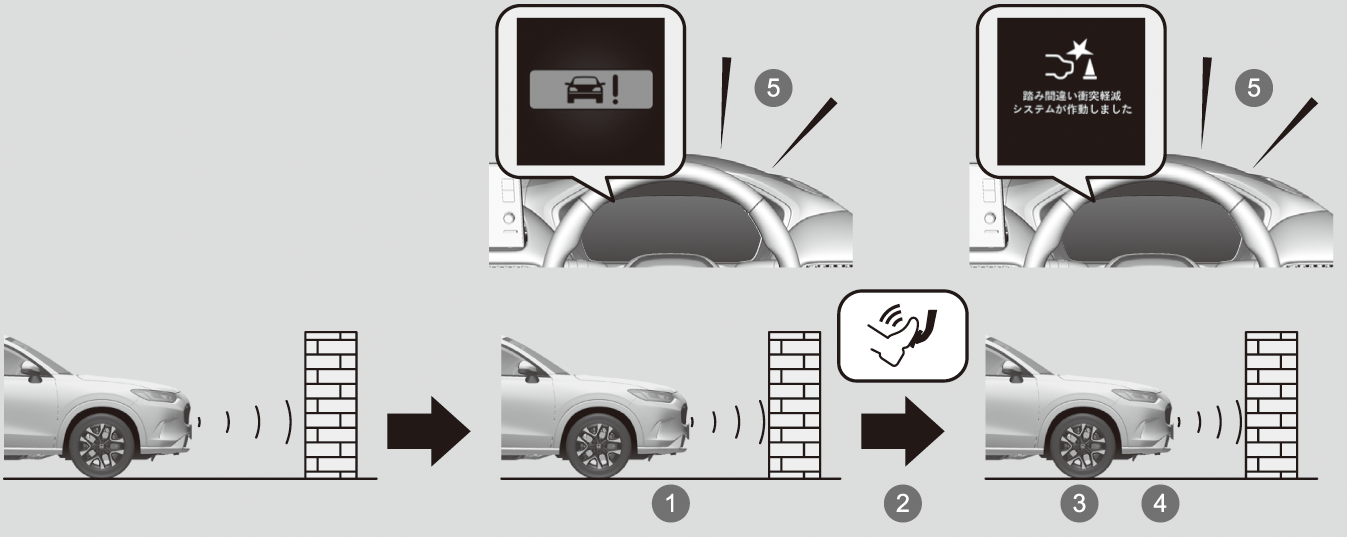 踏み間違い衝突軽減システムは、あらゆる状況でアクセルペダルの踏み間違いや踏みすぎ、または見落としによる衝突を回避したり、衝突による被害を軽減できるものではありません。機能に頼った運転をすると衝突などの事故につながり、死亡または重大な傷害にいたるおそれがあります。