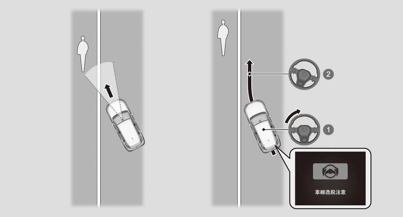 カメラにより歩行者と白線(黄線)を検出し、ステアリング操作を支援することにより運転者の衝突回避操作を促します。