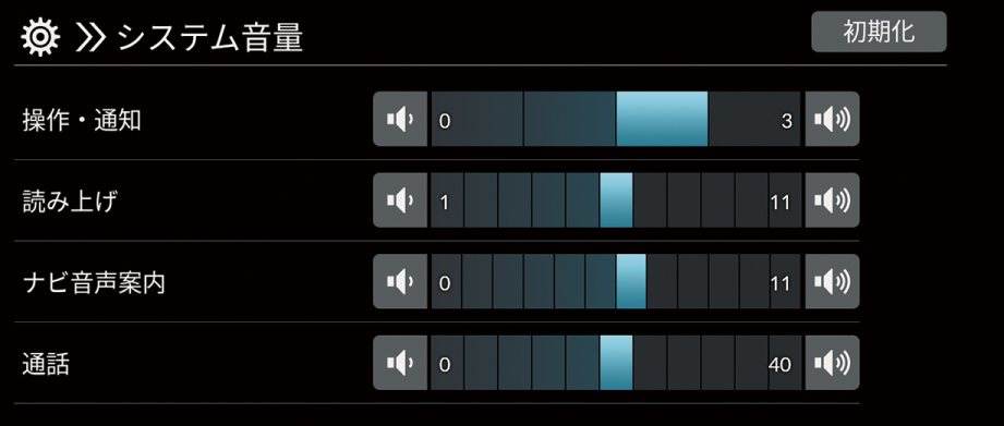 • ナビ音声案内:ナビ音声案内の音量を調整します。0~11の間で調整します。(初期値:6)