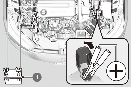 - ケーブルの反対側を、救援車のバッテリーの+端子に接続する。