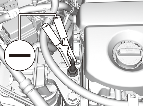 - ケーブルの反対側を、救援車のバッテリーの-端子から外す。