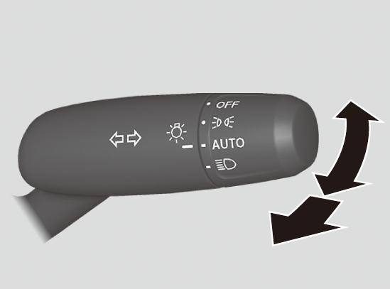 ヘッドライトが点灯しているとき、レバーを前方に押すとハイビームに切り換わります。手前に引くとロービームに戻ります。