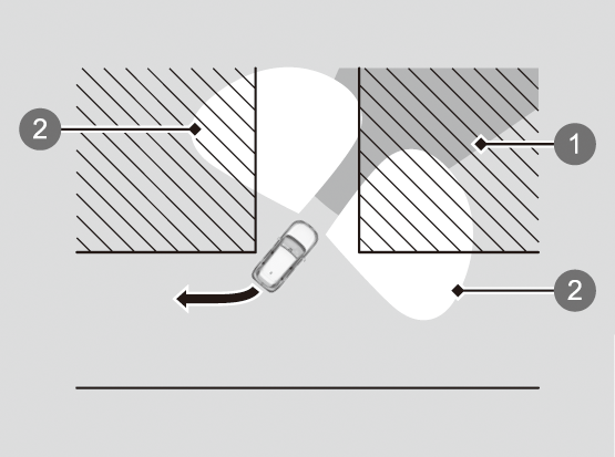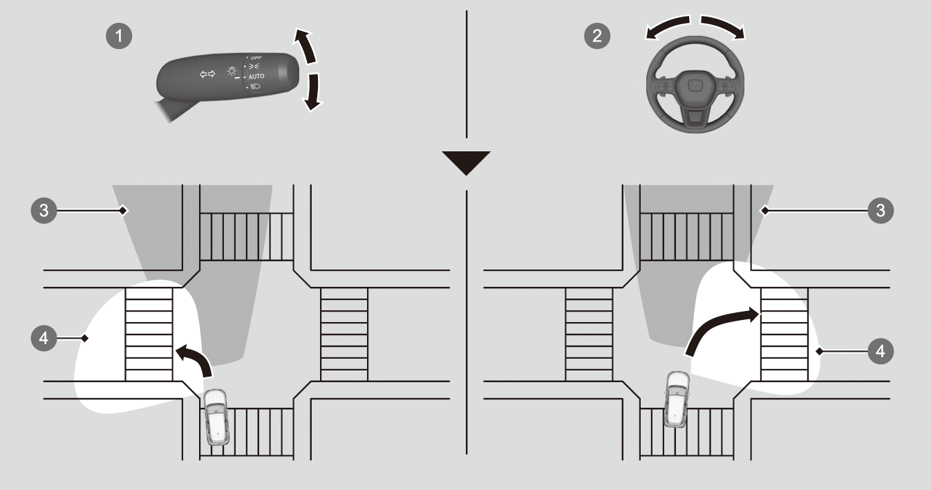 パワーモードがONモードで、車速が40km/h以下のときにヘッドライトが点灯していると、方向指示器やハンドル操作、シフトポジションをRにしたとき、アクティブコーナリングライトが点灯し、夜間走行時にコーナーでの視認性を向上させることができます。