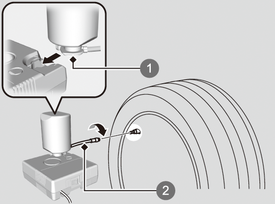 - コンプレッサーはタイヤに応急修理剤とエアを注入し始めます。